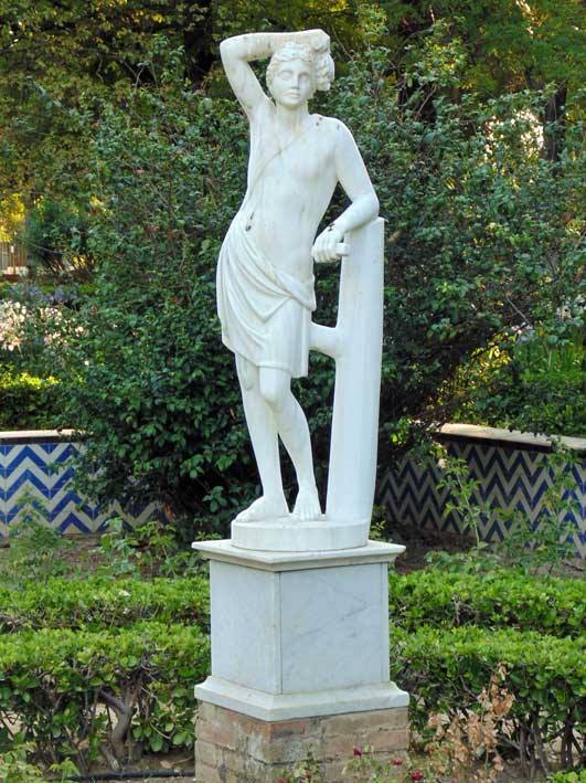 Para finalizar, nos encontramos con una tercera alegoría escultórica en la mas que deteriorada Glorieta de Perú, frente al que fuera Pabellón de Perú de la Exposición IberoAmericana de 1929 , donde vemos a un joven portando un racimo de uvas representado al Otoño .-
