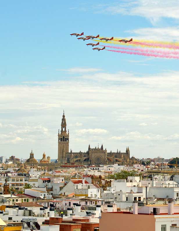 22 de Abril de 2020 Ayer 21 de Abril de 2021 fiesta local en Sevilla hubo un exhibición de la Patrulla Águila por el cielo de Sevilla .- Siete aviones de la patrulla acrobática de la Academia General del Aire de San Javier, en Murcia, sobrevolaron la ciudad desplegando como es habitual en sus actuacioes la bandera de España siendo una actividad organizada por el Acuartelamiento Aéreo de Tablada .- Aqui les dejo unas cuantas instantaneas y video : |