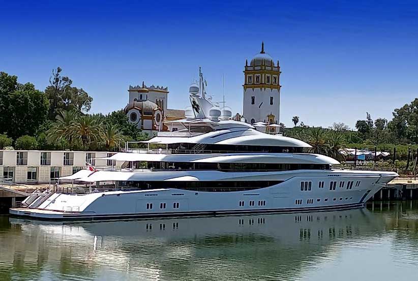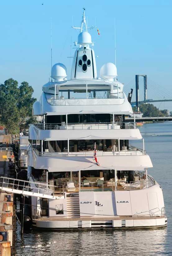 11 de Junio de 2021 A principios de la presente semana, el impresionante mega yate Lady Lara llegó al muelle de las Delicias del puerto de Sevilla , siendo el primero que nos visita durante la pandemia .- El Lady Lara, un barco tipo yacht, de 91 metros de eslora y 14 de manga . Este majestuoso yate, valorado en unos 200 millones de euros, fue construido en 2015 por Lürssen en Schacht-Audorf y ocupa el lugar 51 en el ranking de yates más grandes del mundo. Se considera uno de los más lujosos y modernos yates dentro del segmento de las grandes esloras. El exterior y el interior del yate fueron diseñados por Reymond Langton Design. -