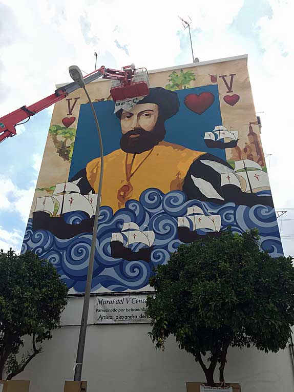 17 de Junio de 2021 Los mismo que en su día les traje aqui MURAL SANTANDERINO DE LA RECONQUISTA DE SEVILLA , y MUSEO EL POLIGONO . Hoy les traigo este simpatico mural de grandes proporciones de la vuelta al mundo sobre la fachada de un edificio de cinco plantas de Sevilla, concretamente en la calle Tarifa, paralela a la Avenida de la Raza . Hecho por la muralista Alexandra del Bene. El mural, reflejan episodios de la expedición de Magallanes- Elcano .-
