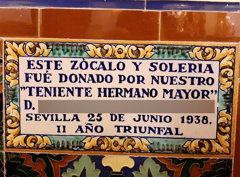 El 25 de Junio de 1938 , España estaba en plena Guerra Civil, era una ensalada de tiros en un inmeso campo de batalla , y miren ustedes por donde, aquí un miembro de Junta de Gobierno de una Hdad X donó el cambio de suelo y zócalo de un templo, de los que muchos fueron quemados , con todo lo que había dentro, por el purrificador fuego rojo en la tarde noche del 18 de Julio de 1936, donación que fué en el II Año Triunfal como era el computo de los años desde el bando nacional .-