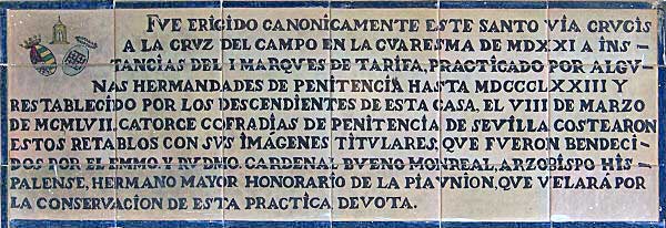 "Fue erigido canónicamente este santo Vía Crucis a la Cruz del Campo en la Cuaresma de 1521 a instancias del Marqués de Tarifa, practicado por algunas hermandades de penitencia hasta 1873 y restablecido por los descendientes de esta casa , el 8 de Marzo de 1957, catorce cofradías de penitencia de Sevilla costearon estos retablos con sus imágenes titulares que fueron bendecia por el emmo y rvmo Cardenal Bueno Monreal arzobispo hispalense Hermano Mayor Honorario de la Pía Unión que velará por la conservación de esta práctica devota" Pero la historia es muy tozuda y lo que es "velar por la conservación de esta práctica devota " velaron muy poco porque el autentico Vía Crucis de Sevilla uno de los dos únicos urbanos del mundo, el otro esta en Roma, pronto calló en el olvido y los retablos cerámicos de la estaciones en su gran mayoría acabaron cayéndose a pedazos , ante la indolencia general y la preocupación de unos cuantos, como ocurre siempre en nuestra querida Sevilla. Y para mas inri en 1975, se inventaron el Vía Crucis del Consejo General de Hermandades y Cofradías a la Catedral, apuntillando si me permiten el termino taurino, una tradición sevillana de siglos y origen de nuestra Semana Santa Cayó tanto, que en otro azulejo, próximo al anterior dice : "Por acuerdo plenario de la Pia Unión de Vía Crucis a la Cruz del Campo los azulejos de sus estaciones fueron completados y restaurados en el año del señor de 1995, siendo hermana mayor la Duquesa de Medinaceli, Marquesa de Tarifa y solemnemente bendecidos el 20 de Mayo de ese mismo año por el Excmo y Rvdmo señor fray Carlos Amigo Valejo Arzobispo de Sevilla" Lógicamente lo que no podía poner el azulejo es que faltaban dos , concretamente los que aquí vemos felizmente recuperados de la noche de los tiempos, y hasta principio del mes de Mayo del presente año sencillamente no estaban. Pero también es de reseñar que en 1957 tampoco se colocaron los tres últimos azulejos por no dañar el Templete y también faltaba el primero que se colocó con posterioridad. No hay que creerse todo lo que dicen los......azulejos.- En la décima estación esta representado por Ntro Padre Jesús de la Penas de la Hermandad de la Estrella, cuya ubicación original estaba en Luis Montoto num 123 y la undécima representada por el Cristo de la Exaltación de la Hermandad de Santa Catalina, ubicado en el Tribunal Tutela de Menores en Luis Montoto num 133. Tanto uno como otro por motivo de obras, demoliciones y restauraciones de los edificios , desaparecieron en silencio como tantas cosas en Sevilla y afortunadamente se han recuperado , ocupando ambas estaciones el mismo sitio, la fachada de Luis Montoto 133, es decir la undécima estación conserva su colocación original , mientras que la décima no, con lo que las catorce estaciones unas las originales de 1957 las menos y otras de nueva planta ,las mas , queda totalmente completado .- Señores de la Pía Unión, señores del Consejo General de Hermandades y Cofradía de Sevilla, ya que por primera vez en la historia el Vía Crucis esta completamente completado, porque no tiran ustedes de sus archivos y recuerdan que el nazareno Jesús del Perdón obra e Juan de Mesa que esta en el convento de Santa María de Jesús de la calle Aguilas; que la réplica del Santo Crucifijo de San Agustín , y el cautivo de Nuestro Padre Jesús Cautivo y Rescatado que se vera en San Ilfedonso, procesionaron en los años de la segunda mitad del siglo pasado , - me estoy refiriendo al XX -desde la casa de pilatos hasta el Templete y no se reencuentran ustedes con la auténtica historia de Sevilla y se dejan de modernos y fotogénicos Vía Crucis catedralicios . Hay quizás tanta o mas historia de Sevilla extramuros que intra muros .- Y lo mas curioso y triste es que de esta feliz y completa restauración nadie ha dicho esta boca es mía. Sevilla es así , se muere en silencio y se recupera a veces tambien en silencio.- TEXTOS DEL AUTOR DEDICADOS AL VIA CRUCIS DE LA CRUZ DEL CAMPO La Sevilla