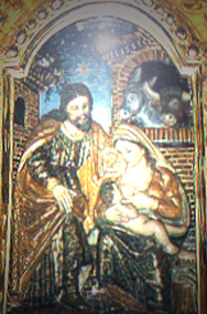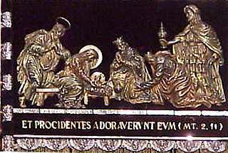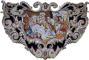 Esta cartela o medallón figura en una hermosa canastilla. Representa una hermosa e inusual escena de la Sagrada Familia donde la Virgen amamanta al Niño Jesus, bajo la mirada de San Jose la mula y el buey.- Posiblemente su autor Francisco Buiza se inspirara en el lienzo de Zurbaran titulado Un descanso en la huida hacia Egipto, donde la Virgen da el pecho al Niño Dios .- ¿Una pista?: La imagen del Señor en una de las unicas tres que tiene pestañas |