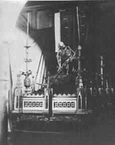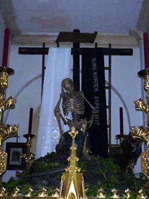 Sevilla domingo 19 de Noviembre de 2000 Si la semana pasada nos parábamos en una reflexión sobre la representación pictórica barroca sevillana de la muerte en In ictu oculi , hoy le toca el turno a la también representación barroca de la muerte sevillana pero escultórica.- El Triunfo de la Santa Cruz, la mas antigua y durante muchos años el único paso con alegoría reflexiva sobre la muerte que ha llegado a nuestros días, haciendo su primera salida procesional en la primera reorganización de la hermandad del Santo Entierro a mediados del siglo XVII , y que en la intermitentes salidas de la cofradía en los años posteriores , hasta que dicha hermandad empezo a salir continuadamente en 1956 y en Sabado Santo; así como participando en los nueve Santos Entierros Magnos que se han celebrado a saber en 1850, 1854, 1890, 1898, 1910, 1920, 1948, 1965 y la ultima 1992 . Hago esta puntualización porque muchos sesudos capillitas hablan de diez Santo Entierros Grandes incluyendo una participación extraordinaria en el año 1915 del Cristo del Amor y la Mortaja, esto no fue un Santo Entierro Grande.- Pues bien nos encontramos ante todo un alarde escultórico de un escultor barroco anónimo de tener como modelo a un esqueleto , plasmándolo con el realismo propio de esa etapa. Erróneamente se le ha atribuido a Juan de Astorga, cuando realmente fue su restaurador ( de restaurar , no porque tuviera un restaurante )a principios del siglo XIX. Como decíamos estamos ante una alegoría donde la muerte con su guadaña en una actitud reflexiva sentada sobre una bola que representa al orbe terráqueo a los pies de una cruz vacía de donde prense el sudario y un lema "Mors mortem superavit "(para los que anden chungo en latín :"La Muerte venció a la muerte"), mientras el pecado representado en forma de dragón se enrosca vencido a los pies de la Cruz .- Vemos que el mensaje cambia ya no es un muerte dominante que desafía con su certero final , sino una muerte vencida por la esperanza de la resurrección , de una vida eterna ,de una vida después de la muerte; en suma un visión alegórica de la muerte no como fin sino transito a la Vida con mayúsculas .- Sobre un paso de 1880 de estilo neogotico que ha llegado a nuestros días, presenta dos curiosas peculiaridades por un lado un exhorto floral "valdeslealiano" con yedras ( que tanto agradecen los autores de diccionarios cofradieros cuando llegan a la letra Y ) y cardos borriqueros dando un imagen apocalíptica a la escena y que el llamador no está sobre el frontal de la canastilla como en todos los pasos sino oculto en la parihuelas situado en la zambrana delantera, a modo de secreto , lo que obliga al capataz a retirar los faldones cada vez que va a llamar .- El pregonero Jose Maria Javierre Orta en su pregón de 1993, quizás ha sido de los pregoneros que mas espacio le ha dedicado y que nos sirve de introducción a los siguiente. El padre Javierre dijo en aquella ocasión : "El paso de la muerte lleva siglos despertando la curiosidad y los comentarios de Sevilla, muchos de cuyos habitantes cruzan los dedos , medio en serio medio en broma, cuando pasa el esqueleto. Le colocaron el nombrecito zumbón, aficionados que somos a desdramatizar situaciones :"La Canina", decimos será por aquello del hambre canina. Representa una pincelada irónica y como tal soporta ciertas bromas sutiles" Creo que es un magnifico resumen a la realidad, porque como Triunfo de la Cruz es poco conocida , siendo reconocida por todos como "La Canina". Lo que detona otra visión ante la muerte del sevillano, como una falta de respeto al miedo de morir, como un hablarle de tu a tu, como sacar un chiste de una situación dramática quizás para mitigar el dolor de la misma. Como dijo una vez Napoleon : " Cuando Andalucía ríe el mundo tiembla" haciendo referencia al también humor negro andaluz y sevillano .- Textos dedicados a La canina dentro de la sección: