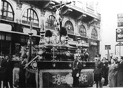 Sevilla 14 de Enero 2001 No hay duda que el blanco y negro es distinto, hasta el humo de los cigarrillos tiene una mágia especial, esta foto no es tan antigua y parece un cuadro que vamos a analizar detenidamente.- El lugar es facil de localizar es la calle San Pablo, y el magnifico edificio regionalista que vemos de fondo que afortunada y milagrosamente hoy existe. ¿La hora ? , las primeras claras del dia de un Viernes Santo de 1929, con un flamante paso del Cristo de Calvario tal y como hoy lo conocemos cuyo canasto obra de Francisco Farfan de 1909, claramente inspirado en el paso del Señor del Gran Poder.- En 1927 se bordaron estos magnifico faldores con el diseño de Farfan y un años despues los soberbios faroles. Absurdamente la hermandad decidió retirar los faldones que aqui vemos, pero con buen criterio volvió a rescuperarlos.- El magnifico Cristo del Calvario es obra firmada por Francisco de Ocampo en 1612, segun pergamino que se encontró en el interior de la imagen con la curiosidad que adosada al mismo iba pegado un trozo del Lignum Crucis , que hoy va como reliquia a los pies de Ntra Sra de la Presentación.Esta imagen es "primo hermano" del Cristo de las Clemencia de Martinez Montañez que se puede admirar, previo pago en nuestra Patrialcal, Metropolitana y Parque Temática Catedral. El Cristo del Calvario se puede venerar gratis en la Parroquia de la Magdalena de hechuras catedralicias.- No se pierdan el detalle en la imagen de la guardia civil de gala y los guardias de asalto con sus gorras de plato tipicamente ladeadas, cual sombreros de ala ancha. El aguador con traje y un público impecablemente peinado, trajeado en un época ya perdida , en un dia que al estar el Señor muerto, se cerraban los cines, en la radio solo se emitia musica sacra y hasta se hablaba bajito.- Curiosamente con todos los traslados de imagenes que hay a los pasos, "el traslado" es sinonimo de Cristo del Calvario que se celebra de forma solemnisima el Sabado de Pasión y es uno de los pórticos obligados a nuestra Semana Santa . Otra curiosidad es que tras la Guerra (in)Civil, y dada las multiples carencia de todo entre ellas de cuero se decidió que los nazarenos fueran con alpargatas negras, siendo hoy la unica que que lleva este característico calzado .- Este año ha sido nominada por el Consejo