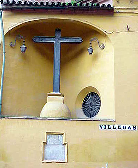 Sevilla 26 de Enero 2001 Ya que estabamos en la Plaza del Salvador ante la estatua de Juan Martinez Montanes y tras contemplar la incomensurable imagen del Señor de Pasion en su novena de la Iglesia del Hospital de la Paz, me he detenido un instante en esta esquina de la plaza con la calle Villegas , antes Culebras ( lagarto, lagarto ) y la lapida que hay a sus pies.- ¿Cuantas veces habremso pasado bajo ellas sin tener ni idea de que simbolizan ?. Les adelanto que no tiene relación una con otra.- En lo que a la lápida se refiere fechada en 1714 hacia referencia a la ley 11 del rey Juan I por la cual se castigaba a todo aquel que no se arrodillase al paso de Jesus Sacramentado , como es costumbre en esta ciudad "aunque fuera en el lodo" sera penado con la perdida del caballo o multa de 600 maravedies . Basta ver la procesion del Corpus o las procesiones parroquiales del mismo para observar como la gran mayoria de los sevillanos en pleno siglo XXI mantienen dicha tradición . Y no por la pena de perder un caballo o el utilitario o 600 maravedies que si les digo la verdad no se cuanto seran en euros, pero que seguro que es una pasta .- Respecto a la Cruz conocida por la Cruz de la Culebras por el antiguo nombre de la calle . Esta Cruz pertenecia al cementerio parroquial del Salvador y estuvo situada en medio de la plaza del mismo nombre, siendo ordenada retirar a mediados del siglo XVIII por el asistente Olavide , como tantas cruces que estorbaban, según las autoridades el paso de peatones , carruajes y caballerias, en Sevilla que pasaron a empotrarse en las fachadas de calles e iglesias donde se encuentran en la actualidad .- Esta cruz de cementerio suele confundirse con la Cruz de los Polaineros. que se encuentra en la Iglesia del Salvador pero no es esta encontrandose dentro de su patio de los naranjos y que hoy es complicado ver por las obras de restauracion que se estan acomentiendo en dicha parroquia .- Esta Cruz de los Polaineros estaba situada en la calle del mismo nombre actual Alvarez Quintero y sobre ella existe una doble versión y ustedes como siempre le digo escojan la que mas les guste . La primera es mas materialista simplemente los vecinos de la colación optaron por sustituirla por otra de marmol, esta desaparecio y solo queda la original que hoy contemplamos en el Salvador. La otra versión nos habla de un altercado callejero durante una procesión del Corpus que llevo a la muerte de un pobre señor y con el objeto de purificcar dicha calle donde ocurrio tan luctuoso suceso de coloco la merita cruz.- Como veran en cualquier rincón de la Sevilla