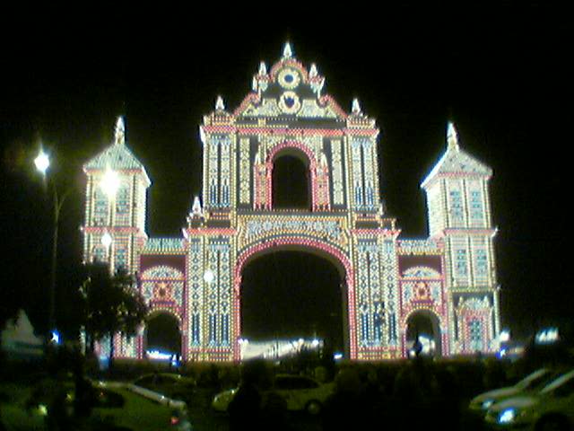 Palabrita del Niño Jesus de la Sacramental del Sagrario . de que esta foto fue tomada en el momento exacto de la iluminacion con un telefono de un amigo de estos modernisimos que hacen fotos y enviados via e-mail directamente a mi cuenta de correro electronico y maravilla de maravillas de la tecnica el correo con la foto me ha llegado ! HOY !, Miercoles "Santo" de Feria .- No voy a dar nombre de telefonos, ni de servicios telefonicos ,pero ya se lo que tengo que hacer el año que viene , volver a cargar con mi camarita digital y dejadme de confiar en servicios on line, que resultan on lentos.- No obstante he aqui la portada de este año en todo su esplendor . tomanda desde fuera de la Feria desde la calle Asuncion del barrio de los Remedios y magnifico portico del Real del presente años.- PERDONEN LAS MOLESTIAS,PERO ESTO HA SIDO POR RAZONES "TERNICAS"AJENAS A MI VOLUNTAD Julio Dominguez Arjona