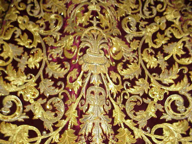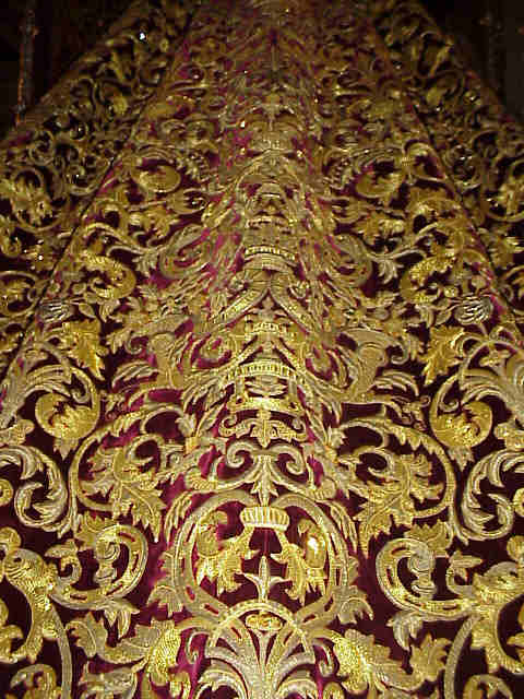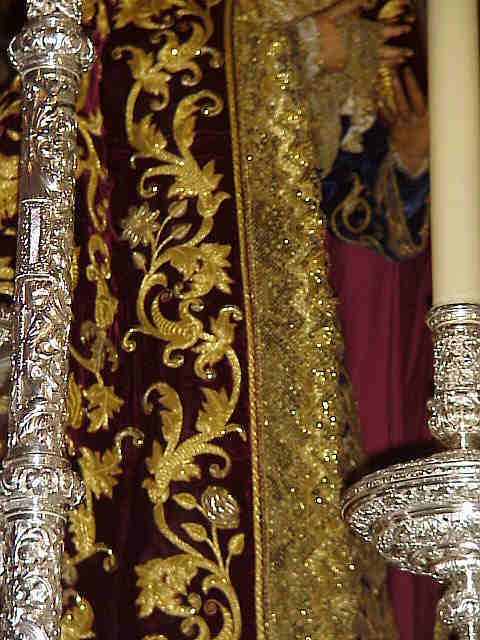 HERMANDAD DE LA AMARGURA MANTO La genial obra de Juan Manuel Rodriguez Ojeda vuelve a recuperar todo su esplendor gracias al impresionate trabajo de pasado del bordado realizado por el bordador Jose Ramon Paleterio como se puede apreciar en las presente imagenes y que podramos difrutar en todo su majestuosidad el proximo Domingo de Ramos Observese tambien el detalle de la anchura de la blonda que se ha realizado ex proceso