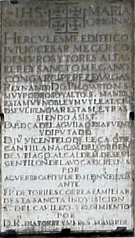 Resulta curioso que hay lugares en Sevilla que se han modificado muy poco en el devenir de los tiempos, si algún día se pudiera viajar en el tiempo ( cosas mas raras se han conseguido), el hipotético turista temporal podría tener la sensación de no haberse movido en el espacio-tiempo; pues bien con la Puerta de Jerez ocurre justamente todo lo contrario, su mutabilidad a través de los años ha sido constante, por lo que hoy habría que hacer un ejercicio de metal para imaginárnosla.- Puerta existente en la fortificación musulmana, que daba salida natural a la ciudad de Jerez de la Frontera, de ahí el origen de su nombre . Curiosamente desde la época almohade de su construcción , hasta el año 1836 era una puerta , entre dos torres con un rastrillo, a saber una gigantesca reja que se podría bajar y subir dejando aislada y protegida a la ciudad . Si el curioso lector ha pasado debajo de la hermosa y si conservada Puerta del Sol de Toledo comprenderá perfectamente lo que estoy diciendo.- Justamente en esta puerta de torres y rastrillo, estaba colocada desde 1578 la lapida que aquí contemplamos, con este bello resumen histórico- poético de Sevilla : HERCULES ME EDIFICO