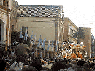 A la izquierda la impresionante carreta de plata de Triana dice adios a Ntra Sra de la Estrella Coronada y se vio la calle San Jacinto como una tarde de Domingo de Ramos llena de gente de "paré a paré", como dicen los trianeros .- A la derecha la majestuosa imagen de 36 carretas de bueyes, en hilera como un rosario blanco de misteriosos gloriosos cruzan la calle San Jacinto engalanada de colchas y mantones de Manila entre el gentio que se arremolina .- Señores decir Triana es decir Rocio, decir, Rocio es decir Triana, lo contrario es negar lo evidente JULIO DOMINGUEZ ARJONA (texto y fotos)