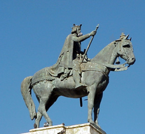Desde su pedestal de la Plaza Nueva el Rey Santo otea el horizonte sevillano..lo que no sabemos si le gusta lo que ve |