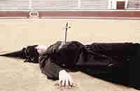 Las comparaciones son odiosas pero en este caso son justas y necesarias. Traigo aqui una muestra de imagenes recopiladas de internet (si alguien no quiere que las publique que me lo diga y las quito corriendo) con un fin meramente ilustrativo y documental del texto .- En primer lugar fotogramas de la pelicula Nadie Conoce a Nadie donde se ve a nazarenos disparando pistolas de laser contra personas , a personas disparando a nazarenos y nazarenos muertos en el ruedo de una plaza con un estoque en el corazon .- Otras imagenes como El Cachorro apuntado por un rifle de mira telescopia, cofrades muertos por un liquido verde que sale de las propias imagenes y señor haciendo guarreridas española con una señora con un antifaz y voladura del pabellon del Vaticano .- Paz Vega actriz sevillana que a pesar de su participación en esta pelicula ha estado a punto de ser la Estrella de la Ilusion de la Cabalgata 2003 , solo sus propios compromisos laborales lo han evitado -Canal Sur la nuestra ( por el dineral que nos cuesta a todos , llego hasta emitirla en su programación Supuestamente ( he dicho supuestamente ) lo ocurrido en esta pelicula inspiro a unos descerebrados a provocar el panico en la tristemente recordaba Madrugada , donde solo gracias a Dios se evitó una desgracia colectiva , dejando en ridículo la imagen de Sevilla ( amen de nuestra fuerzas de seguirdad que no fueron capaces de dar una explicacion a lo ocurrido ) . No paso nada .-